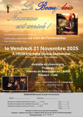 Vendredi 21 novembre : Soirée Beaujolais Nouveau organisée par Le Lien de Fontenailles. (Flyers ci-dessous).